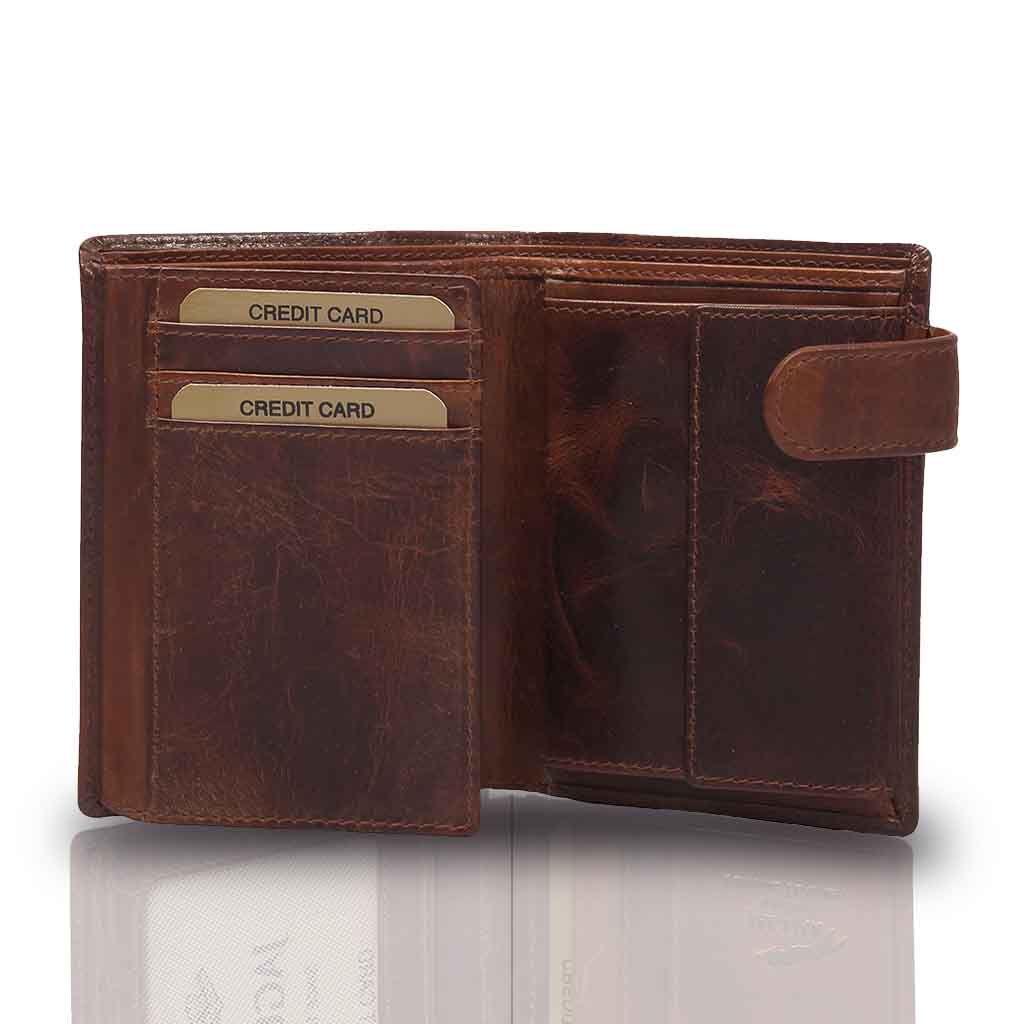 Fabricada con piel de calidad y reforzada en su interior. Cuenta con monedero y tarjeteros, así como un botón para acceder al interior de la cartera.