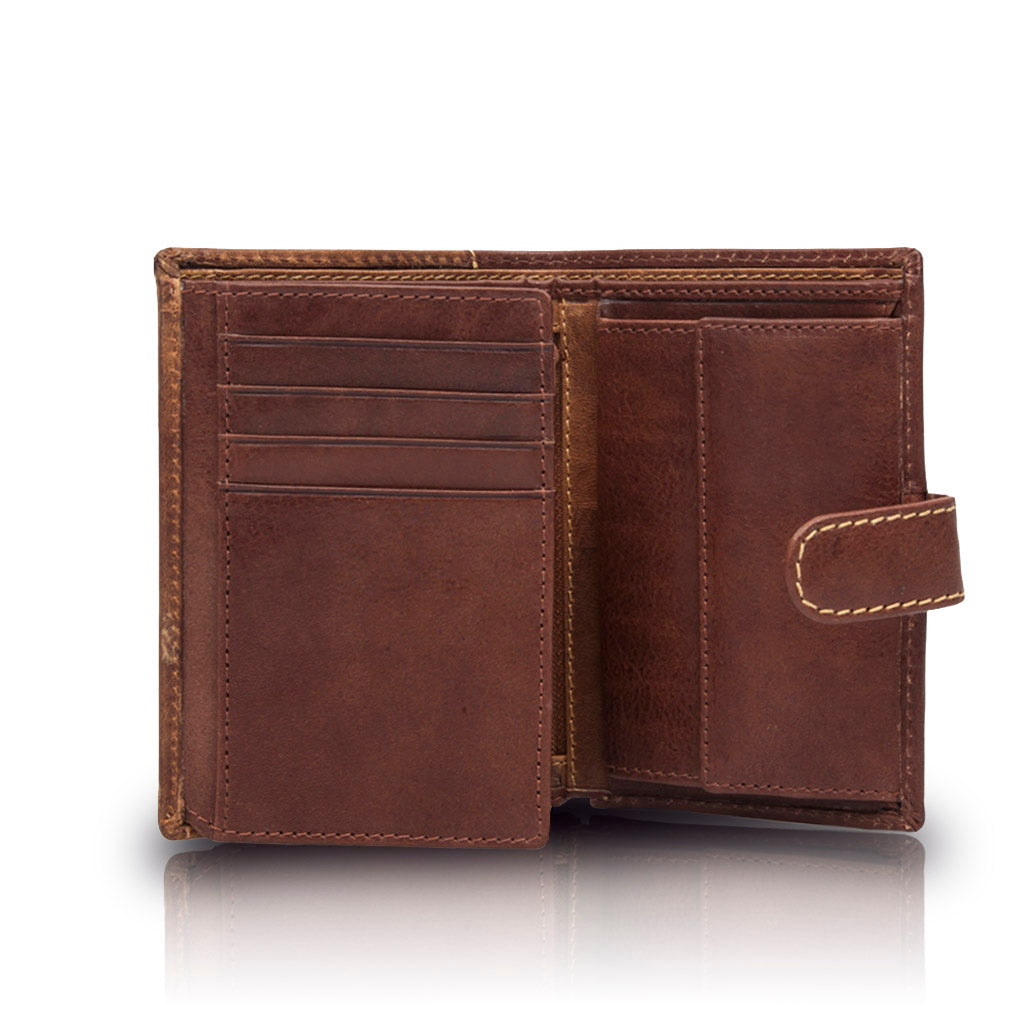 Cartera elaborada con piel de la mejor calidad, cuenta con un botón en su parte frontal que da acceso a su interior con múltiples huecos para tarjetas y billetes y un espacio reservado para las monedas